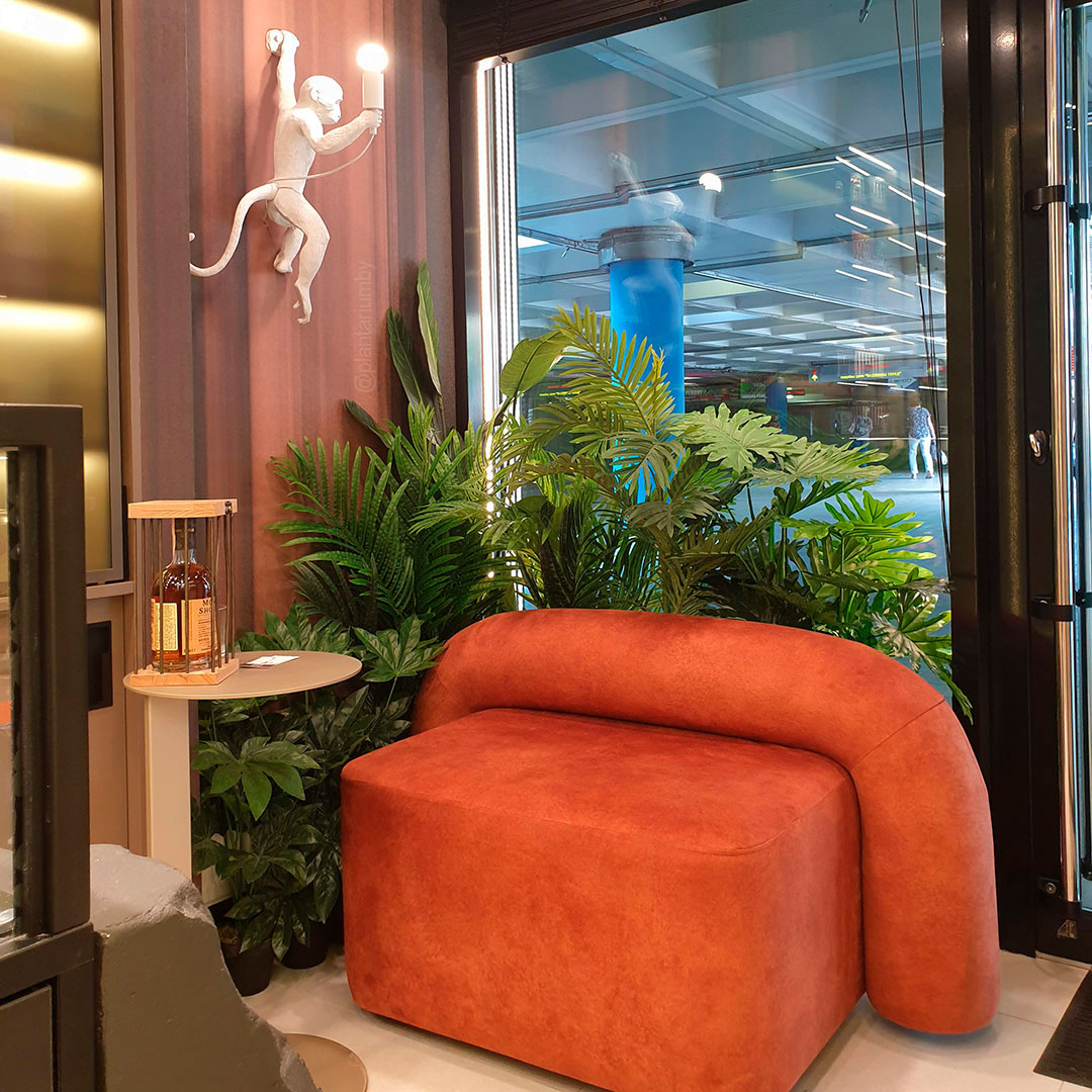 Искусственные растения позволяют создавать зоны любой сложности и формы. Можно скомбинировать растения, которые в природе растут в разных климатических поясах, или использовать яркие неоновые оттенки зелени, если этого требует брендбук компании.